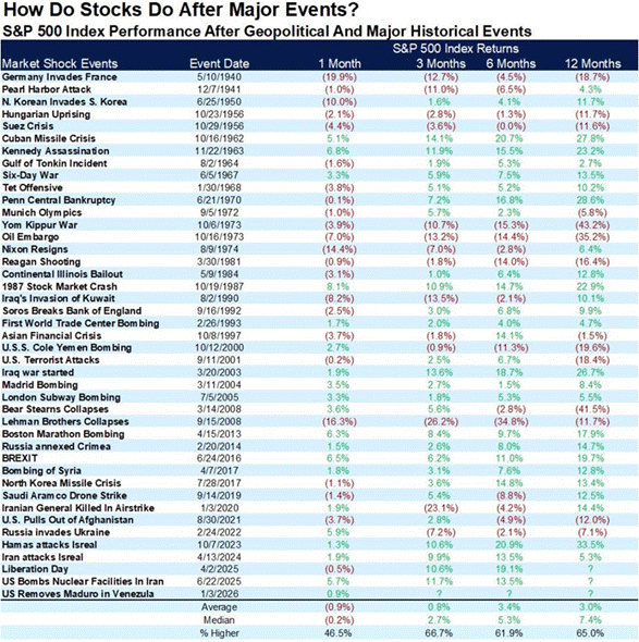 Für die Aktienmärkte zeigt sich historisch ein relativ klares Muster: Geopolitische Schocks führen zunächst zu erhöhter Volatilität und Kursrückgängen. Die Erfahrung der vergangenen Jahrzehnte zeigt jedoch, dass solche Ereignisse in der Regel keinen nachhaltigen Einfluss auf den langfristigen Trend der Aktienmärkte haben. Historische Daten zeigen, dass US-Aktienmärkte nach geopolitischen Eskalationen meist relativ schnell ihre Verluste wieder aufholen konnten und anschließend häufig neue Höchststände erreichten.